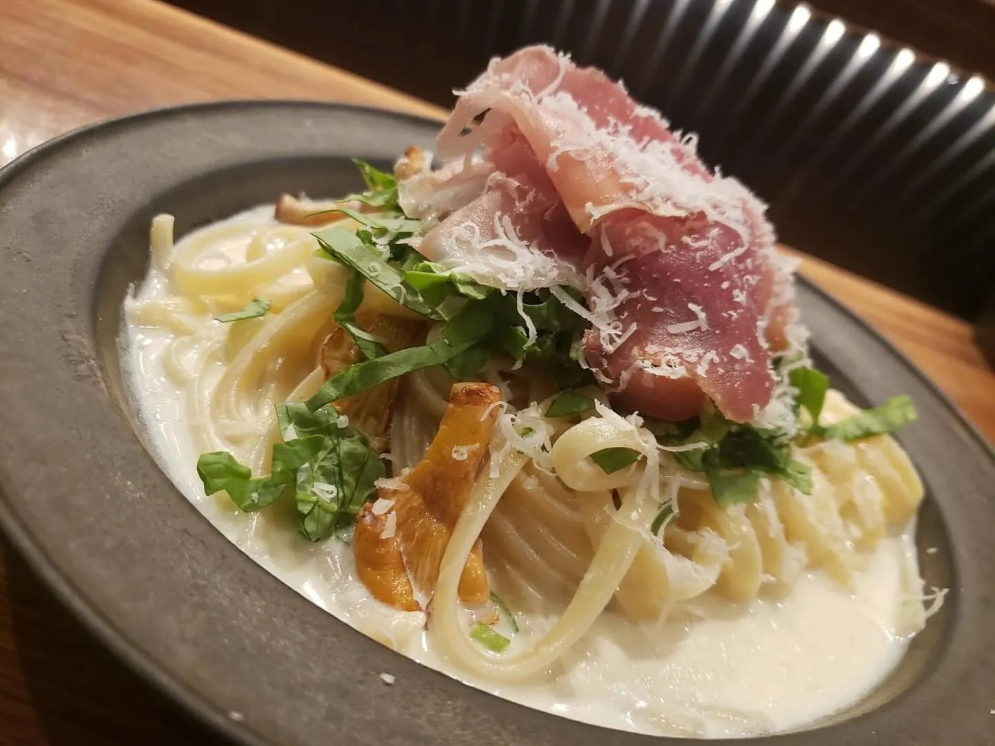 今日のおすすめパスタ 2025/08/04 今日のおすすめパスタ ジロル茸と生ハムのリングイネ 8月も月曜日休まず毎日営業中 新宿イタリアンバルチャルーダ #新宿グルメ #新宿イタリアン #歌舞伎町イタリアン #歌舞伎町グルメ #歌舞伎町ディナー